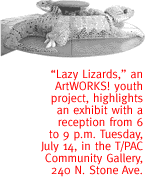 That hard work makes a well-deserved debut in the spotlight in this eclectic new exhibit. It's primarily an informational affair, meant to give the public a glimpse of the nuts and bolts of the ArtWORKS program through displayed project proposals, drawings, models, and pieces in progress. Exhibit runs through August 14, with an opening reception from 6 to 9 p.m. Friday, July 17, in the T/PAC Community Gallery, 240 N. Stone Ave. Regular gallery hours are 8:30 a.m. to 5 p.m. Monday through Friday, and during Thursday Night Art Walks. Call 624-0595 for details. Wednesday 15 ASTRAL TRACKS. The eccentric legacy of George Phar Legler once again receives homage with free, public "moon strolls" through the Valley of the Moon.