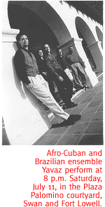CHOIRS AFIRE. Arizona's top belters gather under one high-volume roof at the Gospel Music Workshop of America's annual end-of-the-year musical. The Season of Praise Musicale features choirs from Phoenix, Casa Grande and Sierra Vista, as well as some of Tucson's finest warblers. "There will also be some beautiful liturgical praise dancing," says spokeswoman Rochelle Magee. "It's a modern African religious dance that's full of joy." Admission is free, with music starting at 5:30 p.m. in the Grace Temple Missionary Baptist Church, 1019 E. 31st St., at Park Avenue. Call 293-2978 for more information. STEPPIN' OUT. They take their name from the Spanish phrase ¡Ya vas!, which means "Let's go!" It's an apt title for the spitfire Afro-Cuban and Brazilian band Yavaz. Voted "Best Latin Band" at San Diego's Annual Music Awards, the lively troupe brings a powerful blend of flamenco, salsa, samba and island rhythms to Tucson as part of the Plaza Palomino Courtyard Concert Series. Performance is at 8 p.m. in Plaza Palomino, 2970 N. Swan Road. Advance tickets are $8, available at the Plaza Palomino management office, Hear's Music and Piney Hollow. Tickets are $10 at the door, with a $1 discount for KXCI members. For information, call 297-9133.