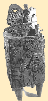Cutline: "Animal Talk Box," raku clay by Maurice Grossman, packs big art into a little package in Davis Dominguez Gallery's two-part summer small works invitational.