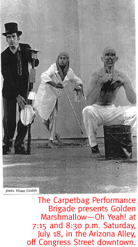 Tonight's jam will feature the smooth, saxophone-laced sounds of Jesse Tovar and his band. They'll perform the first and last sets. The other sets will be open jams, with all musicians invited to join in. Event runs from 7 to 11 p.m. in the Cottonwood Club, 60 N. Alvernon Way. Admission is $4, $2 for TJS members, and free for musicians who come to play. Call 743-3399 for details. FELINE ATTRACTIONS. The Live Theatre Workshop folks focus their creative gaze on house pets in funky footwear, as they present Bruce Bieski's classic fairy tale, Puss 'N' Boots, part of the ongoing Sunday Afternoon Theatre for Children series. Each installment features the troupe's talented regulars in timeless adaptations. Puss 'N' Boots leaps onto the boards at 1 p.m. Sundays through August 30, in the Live Theatre Workshop, 5317 E. Speedway. Admission is $5. For information, call 327-4242. TED ONSCREEN. Master marketer--and highly talented artist--Ted DeGrazia had another side, revealed in a string of short movies he made over several decades. Now the DeGrazia Gallery in the Sun makes the most of the these fascinating vintage works with a summer film series. This week's offerings are collectively titled DeGrazia in the Superstition Mountains. They feature "Elisha M. Reavis--Madman of the Superstitions," "The Lucky Buck Shaft," and "Superstition Mountains, Fiction and Fact." Admission to the screenings and ongoing gallery exhibits is free. Gallery in the Sun is located at 6300 N. Swan Road. Due to the series' overwhelming popularity and the gallery's limited space, reservations are required. For details, call 299-9191.