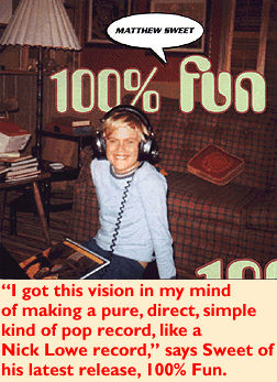 "I noticed right away that I was writing a lot of real pop-y kinds of songs," says Sweet of the batch of tunes written on the road during the Altered Beast tour that became the basis for 100% Fun. "It just seemed like that was the kind of stuff I was running with. So I just got this vision in my mind of making a pure, direct, simple kind of pop record, like a Nick Lowe record or something like that. When I made Altered Beast I didn't want it to be like Girlfriend, so this time around, I didn't want to make a record that was anything like Altered Beast. Although I think it has qualities of both those records--after all, it's still me--and I can't do anything that different."