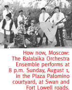 BALALAIKA BALLYHOO. Their hearts lie in Russia, but the Balalaika Orchestra Ensemble resides right here in the Old Pueblo, and performs tonight as part of the Plaza Palomino Courtyard Concert Series. Under the longtime direction of Mia Bulgarian Gay, this great world-music troupe spans emotions and continents with ballads, passionate Gypsy songs and rollicking dance music. They'll be joined by the Kalinka Russian folk dancers, dressed in traditional Russian sarafans. Show time is 8 p.m. in Plaza Palomino, located at Swan and Fort Lowell roads. Advance tickets are $10, available at Hear's Music, Piney Hollow and Plaza Palomino. Tickets are $12 at the door, with a $1 discount for KXCI members. Call 297-9133 for information. HIP TO BE SQUARE DANCING. The Tucson Friends of Traditional Music invite one and all to give folk dancing a whirl at another contra and square dance jamboree. These bi-monthly gatherings are a real, old-fashioned kick in the britches, featuring local callers, hot music by a live string band, and a room full of fleet-footed, friendly folks. Come in pairs or come alone--there's plenty of dance partners available throughout the evening. Introductory session starts at 7:45 p.m., with regular dancing beginning at 8 p.m., in Dance Visions, 318 W. Fort Lowell Road. Admission is $5, $4 for TFTM members, and free for first-timers. For information, call 327-1779.