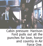 ![]() 'Air Force One' Is Another Film In The Growing Presidential Genre. By Stacey Richter AIR FORCE ONE would be just another throw-away action movie if it weren't for the bizarre and disturbing fact that its hero is a hypothetical manifestation of the President of the United States. President James Marshall (Harrison Ford) is a grim, overworked family man with no discernible politic affiliation; he does, however, believe in honor, protecting his family, and sticking to his word. You may remember it was only last summer that Independence Day brought us Bill Pullman as a wimp-turned-tough President busting honey-glazed aliens. Could this be the birth of a new genre? The President Movie?