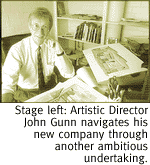 In fact, the audience was asked to run with the dialogue, sans pauses, for the entire play. The Stoppardesque tensions were gone, and the script was tossed at us like cards at a busy blackjack table, giving little chance for rumination. The set, a minimalist rendition of brick and mortar, represents well the security of language, one of the ideas Stoppard's writing attempts to tear asunder. And, after the third-act brawl with pirates, ironically, this set proved to be as unstable as language itself, when an impassioned thespian managed to bring down a bit of the wall with his errant sword. Even if it was accidental, perhaps Millennium should consider repeating this moment of comic relief-cum-metaphor. When it debuted in England in 1966, Stoppard's play was a critical examination of the demise of the British Empire. There was little left for Britain to conquer, and Shakespeare, who'd been the national voice for England, was no longer effective for a disenchanted generation left without clarity of purpose. Thus, writers like Stoppard began to re-examine what the nation's traditional roles had meant. These roles, as played out in the script of Shakespeare's Hamlet, become mutable on Stoppard's stage. Millennium Theatre Artistic Director John Gunn chooses to set his as the backstage of a Hamlet production because of the limbo inherent in such a place. The idea of Production verses Anti-Production is intriguing.