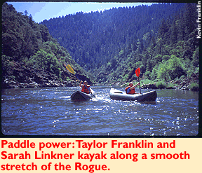 But all these political ruminations seem very far away as we put in the boats at Graves Creek and begin floating down the Rogue. The addition of four inflatable kayaks to our flotilla makes the trip even more pleasant. Most commercial outfitters won't allow you to take a kayak on your own, especially down Class III and Class IV rapids (out of a six-class system, six being highly dangerous and generally considered impossible to navigate, and five the exclusive realm of seasoned river runners). However, if you can find one that will, do it--if you like adventure. Riding in a large raft commanded by a professional, while pleasant, can become somewhat dull. Paddling your own tiny craft into a torrid onslaught of pounding waves and swirling eddies is adventure Nirvana.