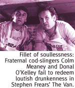 The Van tells the story of two middle-aged, unemployed Irishmen, Bimbo (Donal O'Kelly) and Larry (Colm Meaney), who decide to go into business selling fish and chips out of a mobile food wagon--like the ones you can buy tacos from in South Tucson. They're both married with kids; their lives are unglamorous, their houses are messy, and their favorite pastime seems to be the time-honored double-bill of drinking and vomiting. I think these guys are supposed to be lovable losers, but I couldn't really grasp the lovable part. Maybe if I were Irish; but I'm not, and I found Bimbo and Larry to be loud, drunken, angry characters who mostly panicked and yelled, Irish versions of Fred Flintstone and Barney Rubble. This is rather trying.