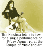 Hinojosa's last visits have been in support of new albums, but this time around her August 15 show at the Temple of Music and Art will be, she says, "just for fun, just to make music." The set list is likely to include several songs from her most recent album, last year's Dreaming from the Labyrinth, the Warner Brothers release that's brought Hinojosa newfound mainstream airplay. (Another Web posting comes from a fan who writes, "I was recently surprised to find Tish on a jukebox in a dive bar on Guam.") But the Tucson show will also offer something of a retrospective, drawing from Hinojosa's varied discography and, she says, favorites like "West Side of Town," from 1989's major-label debut Homeland, and later tunes like "The Vegetable Song." She'll also add covers to her originals; her recent shows and recordings have featured songs by Peter Rowan, James McMurtry, Michael Martin Murphey, Bill Staines, and even Irving Berlin.