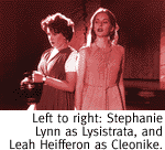 Things looked grim as the play began. It didn't help that the opening scene of Aristophanes' play requires a chorus of masked women to saunter out shaking tambourines and chanting. What was Aristophanes thinking? Nor did it help that when the women, led by Lysistrata, take over the Acropolis of Athens, the entire cast runs around shaking staffs and squealing. You know that cacophonous sound when the kids on The Brady Bunch get in an argument and all try to talk at once? Same thing. The reviewer half-expected a Zeus-like Robert Reed to walk in and say, "Whoa-ho-ho! Let's keep it down to a dull roar." But somewhere within the play's first half hour, the proceedings redeemed themselves. It's unclear why or how, but one half-suspects that the nature of the play brought out the best in this cast of mostly amateurs. Lysistrata is a very silly play with a very bawdy storyline. The long and short of it is that all the women of Athens and Sparta put their men in the figurative doghouse (as they didn't have literal doghouses back then) until they end the 20-year Peloponnesian War. This leaves the men constantly walking around groaning about painful priapic conditions. A viewing of Lysistrata should be required for anyone who thinks Beavis and Butthead, with all their snickering over "morning wood," signal the demise of Western civilization. In 1994, the University of Arizona theatre department produced Lysistrata with more than a few modern touches. These included a revised script full of four-letter words, liberal doses of pop music, and costumes that required the men to wear throbbing cruise-missile strap-ons. Thankfully, this production receives a kinder, gentler updating. Sure, they slip in a few 20th-century colloquialisms, and they play Madonna's "Express Yourself" during the curtain call, but it's not over-the-top. In any case, no one could help laughing when an over-gesticulating, Valley Girl character exclaimed, "Make peace between Sparta and Athens! Duh!" after her whining, pining mate asked what he'd have to do to sleep with her.