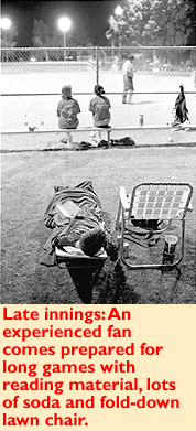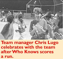Over the next three weeks, our hitting came alive in a big way. Darlene was hitting .833 after the first four games. Then Chris's daughter, Courtney, and Emily, the one with the...um, interesting hair, joined in and we took off. We beat the Blue Jays and No Fear twice each and had a nail-biting tie with the Angels, a game in which we had three runners thrown out at home in the last two innings.