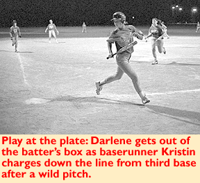 Amazingly, we sandwiched two walks and a single around an out and had the bases loaded with our 2-3-4 hitters coming up. Courtney had raised her batting average to .600, and following her were Darlene, still batting over .700, and Emily, the top home run hitter in the league. I remember thinking, "I'll take my chances, down one with only one out."