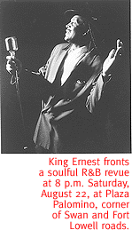 IN ERNEST. It seems he's always been belting out the blues, and perhaps he has. In fact, Ernest Baker--better known as King Earnest--spent some 30 years on the Chicago blues and R&B scene, learning his chops from legends Junior Park and Bobby "Blue" Bland. He leans towards the old Duke/Peacock sound, and when he warms up the chords, he comes closest to Howlin' Wolf, with a healthy dose of James Brown thrown into the mix.