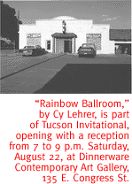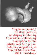 Pacific Coast League Play. Game time is INSIDE OUT. Downtown Tucson's lovely little Central Arts Collective opens its doors and shares wall space for the latest works by a trio of powerful artists in an exhibit titled Starting From Within. The gallery is showcasing cast bronze sculptures by Phoenix artist Mary Bates. She's joined by Tucson artists Carl Rald and Ted Springer. Rald produces watercolor and mixed-media landscapes, while Springer specializes in mixed-media and sculpture. Exhibit runs through August 29 in the Central Arts Collective, 188 E. Broadway. Hours are noon to 4 p.m. Tuesday through Saturday, 7 to 10 p.m. during Downtown Saturday Nights. For information, call 623-5883.