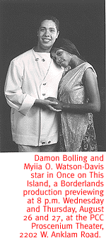 Reminiscent of The Little Mermaid, the tale is retold by a group of Caribbean peasants riding out a violent storm. Their imagination and faith, revealed through poetic dialogue, music and dance, brings the young girl's odyssey to life. Taken from the novel My Love, My Love, by Trinidadian writer Rosa Guy, the drama was later set to music by Lynn Ahrens and Stephen Flaherty, the same team that landed a 1998 Tony Award for their Ragtime score. Produced by Playwrights Horizons in New York, the work initially opened to invited audiences in 1989. By the following April, it was brought to the public amidst great acclaim. Now Borderlands Theater brings Once On This Island to Tucson. Directed by Chris Wilken and choreographed by Barbea Williams, the show features an African-American cast of singers, actors, dancers and musicians, including Myiia Watson-Davis, Damon Bolling, Comel Belin, Sean Tinsley, David Hemthill, Ellen Benton, Regina Wills, David Shaw, Kyra Sellman and Thomas Kivlan.