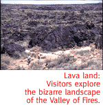 ![]() Hot Times In New Mexico's Valley Of Fires. By Kevin Franklin ICE CAVES? THERE are ice caves out there?" I ask, looking out across the forbidding black lava flow stretching into the distance. Heat waves from the summer sun shimmer across the flow's long-ago solidified surface. "There are a couple of them," says Cheryl Sparks, a volunteer for New Mexico's Valley of Fires Natural Recreation Site. "The blue of the ice in the caves is indescribable. It's bluer than ocean blue," she adds.