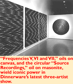 Like Penn and McMahon, the third artist in the show, Katherine Josten, works in a monochromatic palette and in texts. She's a painter who teaches at Pima Community College and founded the Global Art Project. Josten works exclusively in black and white, etching script words into painted canvases cut into circles and squares. Some of her pieces, such as the Frequencies series of vibrating white dots against black, seem like tepid renditions of Op Art. But Josten herself says that all her work is based on a strange metaphysical experience she had 20 years ago; her paintings are meant to be spiritual communications from her source of wisdom. The dots of Frequencies hint at some out-of-galaxy messaging. "Source Recordings," a giant circle some 5 feet wide, conveys an obscure message in an invented language. The solemn religious overlays to Josten's pieces are a bit much to take and, standing alone, each one doesn't add up to much. But assembled as they are at Dinnerware, some 11 paintings strong, they do wield an uncanny, iconic power.