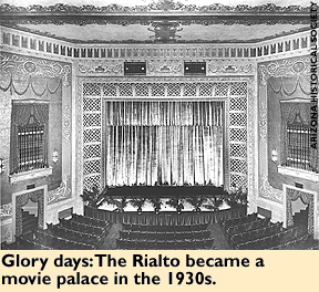 Built in 1919 as the "sister structure" of the Hotel Congress, the Rialto was downtown Tucson's premiere theater, a private enterprise which housed traveling vaudeville and dance companies. While the exact years the theater changed hands are unclear, sometime in the mid-1920s Harry Nace, the movie mogul of Arizona, became the sole proprietor. In the 1930s he became a partner in Publix, a now-defunct Hollywood production company, and converted the theater into a movie palace, touching off a battle of ostentation as theaters such as the Fox, State, Tucson Opera House and the Temple of Music and Art tried to out-do one another. Bear says at one time there were 11 live and motion picture theaters downtown, all vying for their reign as the "queen of theaters."