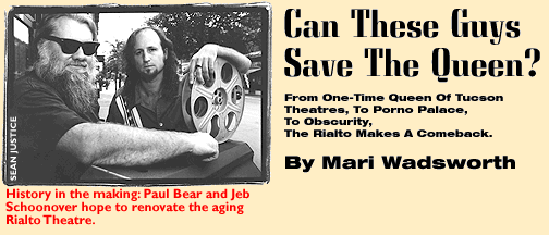 Dan Vinik, director of events at neighboring Hotel Congress, agrees. "What they're trying to do is great. And anything that draws people to this side of the underpass will boost the downtown scene," he says. But the longtime Congress veteran remains skeptical the Rialto can live up to the new owners' expectations. "We (the hotel) made an offer on the Rialto a couple of years ago," says Vinik, "and found it wasn't economically feasible with the resources we had. We figured it would cost about $250,000 just to bring it up to code," which doesn't include necessary improvements like a sound system and stage lighting.