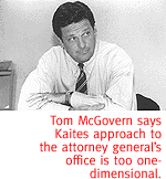 McGovern, now 40, resisted the lure of public office until he'd made his fortune. After law school, he moved to Phoenix to take a job with the firm Black, Robertshaw and Copple, where his practice focused on insurance defense litigation. He started his own firm in 1989, and won a number of lucrative cases, including a $16 million judgment in 1993 against Samaritan Health Systems. Then he accepted a job as Grant Woods' third in command. Under Woods, McGovern served as special assistant attorney general--the spot now-Congressman John Shadegg held under AG Bob Corbin, he always says. Kaites is quick to point out that his GOP opponent has never prosecuted a criminal case, but McGovern reminds him that generally county attorneys, not attorney generals, handle such cases. In fact, McGovern has logged his share of high-profile court appearances. Last year, he defended the state's law banning partial-birth abortions before U.S. District Court Judge Richard Bilby. That was a tough one. Bilby had expressed his displeasure with the law beforehand. But during the arguments, Bilby was so frustrated he actually came down from the bench and, in a somewhat embarrassing development, took over McGovern's questioning of a witness. The state lost. As special assistant attorney general, McGovern also successfully handled appeals that confirmed two death row executions, handled still-unresolved tobacco litigation and argued the tuition tax credit before Arizona's Supreme Court. The court has yet to rule. After 13 months, McGovern resigned to run full-time for attorney general. UNLIKE THE GOVERNOR'S role, the attorney general's is largely that of an administrator. The AG does not set policy; he or she follows guidelines set by the state's statutes. That partially explains why this race has become so ugly: It comes down to matters of personal integrity and administrative ability, rather than a real difference of opinion on policy matters. McGovern and Kaites don't differ significantly on most issues--although you'd never know that, listening to the two of them. A Kaites-McGovern debate strays from substantive discourse at every available opportunity. At a recent match before the Pima County Republican Women in Tucson, McGovern accused Kaites of not supporting Hispanics because he has a plan that would eliminate the AG's civil rights division. "You don't have to trust me," McGovern told the crowd. "Read his handout." Kaites took the mike, shaking his head. "From that document, somehow extrapolated is that I don't like a certain race," he said, laughing and pointing to a young Hispanic woman in the corner. "This is Bettina Nava, my campaign manager." After the dust has settled, and one picks among the detritus, the positions of the two AG wannabes on pertinent issues seem to shake out as follows: Constitutional Defense Council: Kaites supported the creation of the Constitutional Defense Council, Fife Symington's way of skirting Woods and hiring a Washington, D.C., firm to defend Arizona laws subject to constitutional question. Even after the CDC itself was declared unconstitutional, Kaites voted to create another one. McGovern opposes the idea of a CDC. Medical Marijuana: Kaites opposes the use of marijuana for medicinal purposes. McGovern agrees with Kaites, and believes Arizona's law is unconstitutional, but says he will uphold the will of the people, as expressed in Proposition 200, approved in 1996. Open Primaries: Both candidates support the proposal to open primary voting to independent and third-party voters. Indian Gaming: Both candidates support it. Anti-Tobacco Litigation: The state's $2.2 billion anti-tobacco lawsuit is scheduled to go to trial in March. Kaites opposes Woods' current contingency fee plan, which could net the AG's outside counsel almost $400 million. Kaites says that's too much. McGovern says he would not break that agreement. Public Records: Both candidates say they support opening up the AG's Office and releasing AG opinions. Woods has been criticized for labeling such opinions "attorney-client privileged" and keeping them secret. McGovern says that, in contrast to his former boss, he will allow the press access to the inner workings of the AG's Office in almost all cases. Kaites agrees. He even says he is considering setting up a press office at the state's Department of Law. For all his claims of openness, Kaites has run a tightlipped campaign. He refused to grant a New Times reporter any on-the-record interviews during the race, citing his reasons as "campaign strategy." He has, however, responded in writing to some questions. Crime: There is no topic that resonates more with these two than crime. Guess what? Both Tom McGovern and John Kaites hate criminals. McGovern is no pansy. This guy wants to execute child rapists. But it's Kaites who begins stump speeches with the pronouncement, "I hate criminals and I hate crime and I've dedicated my life to fighting crime." This has become a race to see who can be the biggest, the meanest, the toughest, the most effective crime fighter. Even though the AG has very limited authority over criminal prosecutions--in almost all circumstances, those are left to county attorneys--Kaites has all but promised that, if elected, he personally will catch, cuff and prosecute every criminal in the state of Arizona. The Kaites strategy is nothing new. It's lifted right from Fife Symington's 1994 reelection campaign. In 1994, Symington was beleaguered, badgered by charges of financial impropriety and a horrible record on social issues. He made juvenile justice reform his hallmark campaign issue, and won reelection.