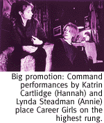 Career Girls takes place during a weekend Annie spends in London with Hannah, her old friend and roommate. As Annie's train pulls in to the station, she flashes back to her student days when she first met the manic, self-obsessed, and very funny Hannah. The scenes showing Hannah and Annie as students are probably the best in the movie--a funny and embarrassing document of youth and style in the '80s. The girls seem barely out of adolescence as they slouch around in asymmetrical haircuts, listening to The Cure (and nothing but The Cure) while vainly trying to apply intellectual theories to the disorder of their lives. Annie has a nervous skin condition and is a compulsive hair-flipper; Hannah is mean, speaks in funny voices and has the irksome habit of using her hand as a talking puppet. Both seem too nervous to survive, even just college. But survive they do, and the contrast between the chaotic confusion that sees them through the '80s and the relative serenity that finds them at age 30 is the main engine of the film. As the story bounces back and forth through time, we see that at 30, Annie retains vestigial remnants of her hair-flipping tic and Hannah is still gruff, but as the story progresses Leigh shows us, slowly and naturally, how the two have gained the perspective they need to understand themselves and each other. This is facilitated by an absurd number of chance meetings with characters from the old days: A lover the two girls swapped (he's an asshole real estate agent who doesn't remember either of them), their sweet but eccentric friend Ricky (terrifically played by Mark Benton), and an old roommate. Though the number of chance encounters Annie and Hannah have is ridiculous, it somehow makes sense in the context of the film--there's a kind of A Christmas Carol feeling, as though some benevolent force were guiding the two back over the rocky points of their lives so that they can learn from them. It's really the wonderful acting, though, that makes this film so out-of-the-ordinary. Katrin Cartlidge manages to infuse the rather cruel Hannah with such wild energy and vulnerability that it's impossible not to like her. Lynda Steadman is delightfully twitchy and broken as Annie, the more sensitive friend. Both women give big, exaggerated performances that nonetheless ring true; all the performances play on much the same pitch, something Leigh missed in Secret and Lies. To accompany these big performances, Leigh has the grace to create a simple but layered story with a natural sense of drama. Potentially explosive subtext--Annie was sexually abused as a child--is pretty much left in the background. Career Girls never devolves into soap opera, but remains a focused, complex portrayal of a friendship.