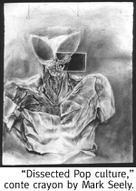 Dahmer, says Pitt, insists on a professional atmosphere in the lab, where he always turned up for anatomy demos impeccably dressed in tie and white lab coat, his long mane of white hair tamed by a ponytail. (Several students did homage portraits of him.) Following Dahmer's lead, says Pitt, the students conducted themselves "with the utmost respect for the individuals who donated their bodies." She says that no matter how much the students dressed up the corpses in their imaginations (and they did), the real bodies were never decorated or desecrated in any way. THE STUDENTS' EXHIBITION is dramatic and sometimes shocking. The works range in tenor from the grimly realistic, like Rachel Rossman's grisly photograph of the sliced head (it looks startlingly like a modern-day mummy), to the emotional likes of Karen G. Fisher's mixed-media artist's book, which imagines a life history for a dead woman she first met as a cold cadaver. Each student had to make anatomical drawings from the live model, who graciously braved the chill of the lab and allowed his naked muscles to be labeled with a grease pen. (Fisher's charcoal and graphite studies of the model, the only ones included in the show, have a classic beauty.) Beyond that requirement, the students could deal with their dead subjects as they chose, and that freedom unleashed some hellish visions: chopped limbs portrayed as dancing puppets, hearts and bones free-floating around dead flesh. The artists seem to have divided into two camps, treating the whole enterprise either with immense seriousness or with the kind of gallows humor that gets medical students through their dissections.