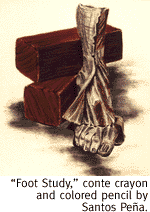 In the giddy camp is a wag by the name of Miko Peru, who painted an imaginary comic book cover. His Scary Tales for Anatomists gives a fair likeness of Dahmer squirting a wetting solution onto a cadaver that's shriveled into a corpus beefus jerkus. Rossman gave the smart-ass name "Palmolive Everafter" to her otherwise compelling photograph of an old hand, spotted with age. More nightmarish is Kristin Decker's "The Puppet," a conte drawing that imagines a weird compilation of bone and flesh. Emily Tellez travels with both camps. Her "Creature of Habit" is a portrait of a young black man's face showing through the body bag's clear plastic. It's deftly, even lovingly, rendered in white strokes of the conte crayon over red, black and gray. Yet Tellez's other works draw on the high-comic goulishness of Mexican death art. Her colored pencil drawing "Candy Man" depicts a fully dissected corpse, his feet forward, body receding backwards, forlorn penis lying inert. Clutched in Candy Man's intact hand is a gaily colored lollipop; scattered around his sliced-up limbs are cruelly ironic Lifesaver candies. Another work taps into the Mexican art convention of twinning sex and death. It's a conte and charcoal drawing of a headless female corpse who's sitting up in her gurney. A string of pearls is draped over the gaping hole of her carved-up chest, a red lipstick is in one hand. Its title: "All Dressed Up and Nowhere to Go."
