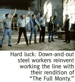 Full Monty begins with an optimistic, '70s tourism film advertising the wonders of the town of Sheffield--a booming English metropolis built around the steel industry. Slums have been cleared, we're told by a deep-voiced narrator, to make way for modern, concrete high rises. There's a soccer team playing in a world-class stadium. Women in Quiana wrap dresses and guys in bell bottoms do the hustle in the discos. "Steel workers work hard, and they play hard!" Cut to Sheffield 25 years later. The town still plays hard, but most people aren't working since the steel mills have closed. Gaz (Robert Carlyle) and Dave (Mark Addy), a pair of out-of-work steel workers, are rummaging through a closed factory for salvage, accompanied by Gaz's sweet little son, who is embarrassed by the whole venture. These guys are down and out, clearly. But a chance encounter with a Chippendale's troupe making money hand over fist at a nearby bar gives Gaz the bright idea to start his own band of strippers. It's a little contrived, yes, but Full Monty is a comedy, and a little exaggeration has to be swallowed. Gaz slowly gathers a motley group of losers. He and Dave discover one future dancer in mid suicide-attempt in his car (he's having mechanical difficulties, and Dave helps him get it started); they have an audition and get a couple of guys there. Between the dancing and recruiting sessions, the guys go to Job Club--dismal classes given by the state to help the steel workers find employment--and pretend to work on their résumés. There they pick up their former boss, the only one of the group who actually knows how to dance. Some of the comedy in this movie is pretty obvious (really, jokes about the size of a black man's penis?); but some has a sly wit and goofy spirit that carries it along at a swift pace. The guys get a video of Flashdance to check out the dancing and end up being more interested in Jennifer Beal's welding. When one of the songs they've been practicing to comes on over the radio in line at the employment agency, the men start unconsciously doing little dance moves in unison.