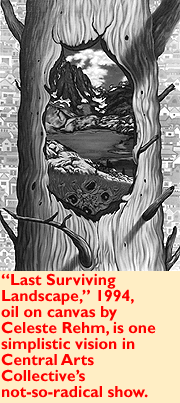 Unlike the sophomoric Brown, Celeste Rehm of Boulder is intent on a serious presentation of her issue--overdevelopment of the Colorado wilderness--but her painting too is simplistic. "Surviving Landscape" is a cliché, featuring a pristine Rockies scene of snow-capped peak, clear water and green trees encircled by the endless pink houses of new suburbia. Worse, it's more illustration than painting, rendered in flat, lifeless strokes of the brush.