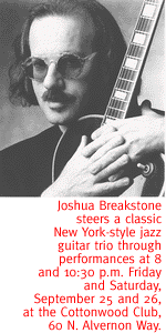 CARRYING THE TORCH. According to Vintage Guitar Magazine, Joshua Breakstone "plays like the old guys. His influences are the players who came up in the '50s and '60s, and mixed blues and be-bop influences." One of those major influences was Grant Green, responsible for putting the guitar/organ trio on the map in the post-war period. Now Breakstone carries on Green's legacy with two performances at the Cottonwood Club. He'll be joined by the Tucson rhythm aces Ed Friedland on bass, and Dave Jeffries on drums, for a night of New York-style jazz guitar at this increasingly jumpin' midtown club. Performances are 8 and 10:30 tonight and Sunday in the Cottonwood Club, 60 N. Alvernon Way. The 8 p.m. show includes dinner from 6:30 to 7:30 p.m., for $19.95. General admission for the 10:30 p.m. show is $8. For reservations and information, call 326-6000.