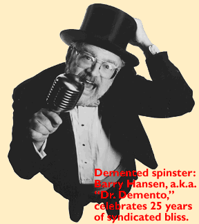 It's now 25 years into his strange musical banquet, and Dr. Demento still cherishes responses and interaction from his listeners. "People can send me anything, anything at all," he chirps cheerfully. "No dead puppies, please, but anything else is fine."