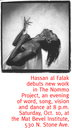 Curtain is at 7:30 p.m. in the Catalina United Methodist Church Fellowship Hall, 2700 E. Speedway. Performances continue at 7:30 p.m. Thursday through Saturday, October 15 through 17. A dinner package is optional. Tickets are $10 ($17.50 with dinner), available by calling 721-9640. DREAM WORLD. Visit a high-end version of your youthful pastime at the Pima Air and Space Museum's Model Fair and Demonstration. The event highlights the incredible models of flying crafts, which share museum space with their life-size counterparts. Master model-makers will be on hand to demonstrate their painstaking craft, and there will also be plenty of fun stuff for the kids. Fair hours are 9 a.m. to 5 p.m. in the Pima Air and Space Museum, 6000 E. Valencia Road. Admission is $7.50, $6.50 for military and seniors, $4 for kids ages 10 to 17, and free for kids ages 9 and under. Call 574-0462 for details. ECLECTIC JOURNEY. Convention takes a refreshing nose-dive when the Mat Bevel Institute hosts the eclectic, excellent Nommo Project, featuring performer Hassan al Falak, vocalist Kind Essence, pianist Samuel Curtis, and performance artist Shakiri. Winner of the 1994 Statewide Arizona Arts Award, al Falak will perform the dance theater work Tales of Flying Africans, incorporating everything from Dogon cosmology and Duke Ellington to Sun Ra--and even a bit of black aviation history. Kind Essence and Curtis will perform Oshun/Cabaret, blending the 1920s-era music of Bessie Smith and Fats Waller with theater and ritual. And last but certainly not least, award-winning Bay Area artist Shakiri performs an excerpt from And Their Children's Children, which recently premiered at the San Francisco Women Working Theater Festival. Performance is 8 p.m. tonight only in the Mat Bevel Institute, 530 N. Stone Ave. Tickets are $10, $7 for students, and are available at the door. Call 792-1994 for details.