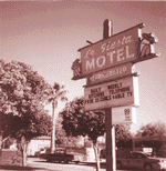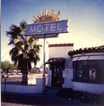 The auto courts' seedy reputation in that era was at least partially deserved. Some were poorly built, poorly maintained, equipped with primitive sanitation systems, and managed by people who didn't care much. Most courts, however, were cozy cabins operated by concerned mom-and-pop owners. Despite the restrictive laws and bad publicity, however, the number of auto courts nationwide had grown to 300,000 units, with 500 more complexes being added to the total each year. The reason was fairly simple. According to The Architectural Record in 1933, the construction of auto courts "has been the single growing and highly active division of the building industry." In other words, mom and pop had come to depend on their little business as a way to survive the Depression. The influx of military personnel during World War II helped Tucson motor courts maintain their business--despite nationwide rationing of tires and gasoline, which drastically reduced travel. Even after 1945, Tucson saw more auto courts going up, some out on Benson Highway to the east of town, while others were built along Miracle Mile. But by the late 1940s, however, the era of the auto court, like an old Model T with bad tires, was slowing to a halt. Motel chains, with their mass-produced, standardized, sanitized, "no surprise" approach to the overnight trade, soon overwhelmed the mom-and-poppers. IN THE PAST few years, the city changed the name of Miracle Mile Strip back to North Oracle Road. City officials were hoping the name change would help curb the prostitution which festered in the area during the 1970s. That--and heavy police patrols--seemed to work. Today, a new Walgreen's, along with other recent business activity in the area, hint that the No-Tel and other early motels along Oracle may soon be history, replaced by something new and shiny and clean. But for now, at least faint traces of Tucson's colorful auto court era linger there. If you look hard enough, you'll catch glimpses of it in a subtle architectural detail, or a few tiny bedroom units with the trademark covered parking between rooms. These quickly fading charms whisper of a time, 60 years ago, when an American road trip was quite a trip indeed, with or without the naughty thoughts.