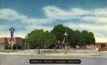Painted-over windows, freshly laundered towels neatly folded, and a paper mat outside the tiny shower highlight the bathroom. The plumbing fixtures are obviously dated, but appear functional. Mirrors above the bed and an "Adult Entertainment Enterprise" business license hanging in the office are all that distinguish the No-Tel from many other early motels that still exist in Tucson. That plus one TV channel showing couples sucking, swearing and sweating. But the heat in the room soon has me dozing off. As my eyelids droop, I dream about the history of auto courts, a topic I've been researching recently. Oh, did I mention the lady joining me was my wife? THE ADVENT OF the automobile changed the American hospitality business forever. Train travelers stayed near the depots, in large establishments like downtown's Hotel Congress. But the freedom of movement brought by the auto moved much of this business to the edges of towns and cities, along the highways. Turn-of-the century pioneering motorists rumbled mostly over dirt paths, but in 1916 the federal government began encouraging the construction of paved highways.