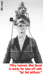 "The other space was intimate, but this sort of is too, because you're surrounded by the feel of things. You're right there, up close to the stage, in the middle of the action." Amen to that. Last week's opening brought all the moving parts together, with an imaginative, two-hour show that lives up to its self-titled "surrealistic pop-science theatre" moniker. He calls the show Jet Set Jettison, which simultaneously refers to one of the sculptural pieces he wears as a helmet in one part of the show, and a character personified from one of his poems. The show, which is a fusion of live performance, recorded music, poetry reading and science demonstration, is all one evolving concept of creative output. At least it comes with instructions: "Like music that ends where it started, the path of imagination is the actual work of art," reads the program. When you play a fictional character playing a variety of other fictional characters, things are bound to get out of hand. But Schaper (or Mat Bevel, or Jet Set Jettison) moves from one sketch to the next with the excitement and confidence of a mad scientist. Although moving easily among his own creations, he convinces us that not even he can be certain of what will happen next. Wildly funny, unpredictably in and out of control, he's like the Willy Wonka of his pop-theatre world. His performances are a marvel of percussive poetry and musical syncopation, and the perfect timing of his on-stage antics with self-recorded original music and multiple tracks of song and spoken word belie the spontaneity he affects on stage. If you're a theatre-goer who likes to "get it," Bevel's multi-layered poetic musings may not be the ticket you're looking for. But for sheer innovation, you can't beat Bevel's one-string bass, 12-volt motorized reindeer cart, the whirring intellectual plane ("Which can also be a boat," he says), or catchy "Quality Gas Mask" jingle. With only two performances planned for the coming year ("one at the beginning and one at the end," which according to the Institute's calendar constitutes October and April), you won't have many opportunities to see this rare genius in his element.