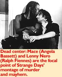 But Strange Days remains a movie movie, and there's still a good deal of substance underneath the flash. The film's real meat is an emotional story about the desperation of Lenny's unrequited love for Faith. As a friend of mine said, he's "the nicest sleaze of the year," a slimy salesman with a heart of gold. His relationship with the principled, strong-willed Mace carries the picture (shakily, but triumphantly) despite its overlong chases through crowds and ridiculous Die Hard-esque series of climaxes.