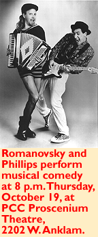 Their collaboration draws from the folk roots of modern culture, with emphasis on the effect of cultural roots on Jewish identity and consciousness. Into the Woods begins at 10 a.m. at the Jewish Community Center, Dodge Boulevard and River Road. Also today, visual artist Ruth Weisberg's Brothers and Sisters exhibit opens with a reception from 2 to 4 p.m. at the Joseph Gross Gallery on the UA campus. Call 577-9393 for information on these and related events.