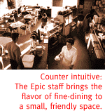 Propitiously located at the center of our city's fashionable counter-culture, Epic is one of the "in" places to be on any given day. Recent modifications to the interior decor--including comfy leather couches, funky metallic light fixtures, a new exhibit of large-scale acrylic canvases by Kevin Johnson, and a re-scaled bar counter to open up the limited seating--all are evidence the ambitious little café continues to stay ahead of the curve. Primarily known for its hearty and healthful soups, salads and sandwiches, Epic is fixed in most people's minds as a fine place to meet for a midday meal. Recently, however, Green has experimented with an evening concept--an idea that's been slow to catch fire in spite of the additional dessert offerings, soft live music, and tableside service after 5 p.m. Hopefully, this oversight will soon be remedied as word gets out. The changes at Epic aren't the only buzz in the air, though. While some northern types might argue the point, fall is indisputably around the bend. And to mark this passing of the seasons, Epic is once again offering its signature cranberry couscous, a fluffy warm repast especially well-suited to chilly mornings.