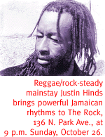 A mere $20 will earn you a hand-thrown bowl--and plenty of great vegetarian creations by Tucson's best chefs. There will also be lots of entertainment, and tons of stuff for raffle, including an NCAA championship basketball signed by none other than Lute Olsen himself. And a cadre of fine artists have donated their works for a live auction. Event runs from 2 to 5 p.m. at Old Town Artisans, 201 N. Court Ave. Admission is $20. Call 623-5111 for details. ISLAND AMBASSADOR. From their early rock-steady and ska days to the present, Justin Hinds and the Dominoes have been a powerhouse of Jamaican music for more than 30 years, remaining a major influence on contemporary reggae. Tonight, they bring that legacy to town for a single performance at The Rock. Born in Steertown, Jamaica, in 1942, Hind was reared in the Christian songs of his father's church. Later, much of his inspiration came from American icons ranging from B.B. King and Louis Jordan to Professor Longhair and especially Fats Domino, who inspired the name for his longtime band. On tour to showcase the group's latest release, Know Jah Better, Tucson audiences will be treated to Hinds' signature lyrics, said to chart "the depth of feeling and heartfelt sincerity of one of reggae's most distinctive vocal artists," along with legendary Jamaica players Sly and Robbie, and guitarist Chinna Smith. Performance is 9 p.m. at The Rock, 136 N. Park Ave. Advance tickets are $10, $8 for students, available at University Postal and Twelve Tribes Reggae Shop. For information, call 620-1810.