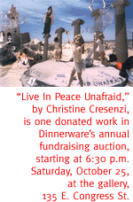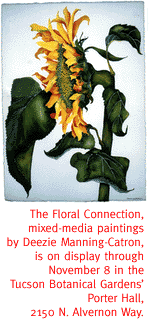 CRITICAL CONDITION. Tucson artist Michael Chittock continues his striking dissection of the human condition with a new exhibit on display in the Dinnerware Contemporary Art Gallery. Drawing from portraits of family and friends, Chittock's pieces explore the fragility of human life, particularly aiming their sights on the mysteries of birth and death. "Painting for me is an addiction," he says. "I want to focus the viewer's attention and provide opportunities for a dialogue between the visual experience and the inner emotional anxieties produced by our society. By presenting combinations of often contradictory and even humorous images, the viewer can address personal, religious and political issues." That effort is a powerful success, according to Paul Ivey of the UA Art History department. "The brutal and disturbing elements of Chittock's subjects are couched in colorful and thick acrylics and wacky theatrical devices," he says. Exhibit continues through November 22, with an opening from 7 to 9 p.m. Saturday, November 8, in the Dinnerware Gallery, 135 E. Congress St. Regular gallery hours are noon to 5 p.m. Tuesday through Saturday, noon to 7 p.m. Thursday. For information, call 792-4503.