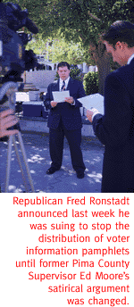 Now Jim's son, Fred Ronstadt, has stepped into public life. A 34-year-old financial analyst with a local HMO, Ronstadt is the Republican candidate facing Democrat Alison Hughes and Libertarian Dan Starr Dougherty in the November 4 general election for the Ward 6 City Council seat being vacated by the retiring Molly McKasson. Ronstadt is squeezing the family name for as much mileage as he can--an early campaign flier even carried the slogan, "With a name like Ronstadt, he's got to be good!" "Something my dad and my family has installed in my heart is that the most noble thing you can do is serve," Ronstadt says. "From growing up and watching my dad make pancakes at the pancake breakfast at church, all the way to the things he's able to do now in his position as a civic leader with the Centurions and the Conquistadors." But in Alison Hughes, Ronstadt is facing an opponent who has her own record of political activism in Tucson, dating back more than a quarter-century. An administrator with the UA Rural Health Service, the 57-year-old Hughes found herself drawn into politics almost as soon as she emigrated to the United States from her native Scotland. A young lass of 19, she came to attend school in the Washington, D.C., area. It was 1959, and she recalls Republican friends tried to recruit her to support Barry Goldwater. "I was new and watching everything in the United States and I really liked what John F. Kennedy was saying," Hughes remembers. "It touched my heart through and through and I thought, 'No, I couldn't be a Republican.' " When Hughes moved to Tucson in 1970, "It was love at first sight." She soon got involved in local government, working with the Democratic Party, political campaigns, neighborhood associations, minority groups, women's organizations and a host of other civic-minded causes. Along the way, she's built a solid political base which helped her pull off an underdog victory against four other Democrats in the September primary. Given the registration advantage Democrats enjoy citywide--there are more than 129,000 Democrats and fewer than 84,000 Republicans--Hughes is considered the favorite. As of October 6, she'd raised more than $55,000, including $25,000 in taxpayer matching dollars, which has funded a well-run campaign. Ronstadt's campaign, meanwhile, is struggling for attention. As election day approaches, he's reported raising only about $15,000--and he still hadn't secured his eligibility for matching funds, although he did apply for the dollars on October 9. His campaign still hasn't struck a chord with either the media or the public. So last week, Fred Ronstadt did what so many Americans do these days: He filed a lawsuit. RONSTADT'S SUIT DEMANDED the city stop distributing this year's voter-information packet until they removed former Pima County Supervisor Ed Moore's argument on Proposition 201, the contentious developer-backed initiative that would overturn the Water Consumer Protection Act, an initiative passed by more than 56 percent of the voters after a bitter battle just two years ago. Moore, who worked to pass the Water Consumer Protection Act in 1995, had written a satirical argument favoring its repeal. "Prop 201 may not be perfect; but if it's bad for families, homes and children, at least it will be good for builders and developers, who'll be able to build a lot more subdivisions," Moore wrote. "Prop 201 will bring CAP river water right back to our homes, and isn't that a fair price to pay for growth, development and progress." Ronstadt, represented by the high-priced, high-powered law firm Lewis & Roca (which has contributed at least $1,000 to a campaign supporting Prop 201), complained Moore's argument should have been included in the anti-201 portion of the ballot pamphlet.