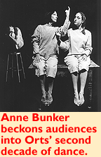 A new untitled trapeze work by Bunker, performed last April in Reid Park as a work-in-progress, is also on the bill, along with "Past Reflections," a video/dance collaboration first danced at the Temple late last winter. It offers videography by Nancy Solomon and by Bunker's husband Chuck Koesters. The only non-Bunker work in the show, "Shake It Up," is a "fun, dancey piece," by the New York choreographer Elyn Feldman. It was composed for dancer Beth Bauman, an off-again, on-again Orts dancer who, Bunker reports, is now back home with the company to stay.