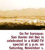 WHITE DOVE REDUX. The White Dove of the Desert has recently enjoyed a painstaking facelift and triumphant rejuvenation as the only remaining Mexican baroque church in the United States. Now KUAT-TV, Channel 6, celebrates the lovely outpost's rebirth with Divine Mission, San Xavier del Bac. Linda Ronstadt narrates this fitting tribute to a Tucson treasure. Divine Mission airs at 3 today, and 9 p.m. Wednesday, November 19, on Channel 6. Call 621-3354 for details. ASANTE UP. The Gospel Music Workshop of America joins the Barbea Williams Performance Company for the Asante (Giving Thanks) Celebration. Held in conjunction with Downtown Saturday Night as part of the African American Celebration Series, this outing will showcase the workshop's rousing contemporary and traditional spirituals and freedom songs, as well as the Williams troupe's spiritual dances in lush white, purple and gold costumes. Event runs from 7 to 10 p.m. at the Ronstadt Transit Center. Other DSN performances include the Juju Bey Ensemble from 8 to 10 p.m. in Arizona Alley, Gerry Glombecki from 7 to 10 p.m. in Fourth Avenue's Winsett Park, and the Rusty Boys from 7:30 to 10 p.m. on Pennington Street, between Scott and Sixth avenues. All events are free.