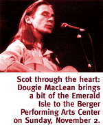 SONGS OF SCOTLAND. Though touted as Scotland's "most talented and well-known singer/songwriter," Dougie MacLean remains largely an undiscovered gem for American audiences. A prominent figure in the Celtic music revival launched back in the '70s, he may be more widely recognized as a former member of both Tannahill Weavers and Silly Wizard. Among his many songwriting credits over the past two decades are "Ready for the Storm" (recorded by the Grammy-winning Kathy Mattea in 1990), featured tracks for the film Last of the Mohicans, and "Caledonia," now considered a folk-standard among Celtic vocalists. He's touring to support a new release, Riof, which includes a rendition of the oft-requested "Feel So Near" that features Kathy Mattea.