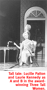 The whole first half of this two-act play is a tug-of-war among these three characters, a struggle that's sometimes as tedious, and as painful, as listening to one's aged loved ones recounting the same stories again and again. Yet the way Albee writes of the random stirrings of memory among the aged is near-perfect, as is his depiction of the heartbreaking deterioration of the body and the loss, through mental collapse, of one's own life before death. It's an uncomfortable work to sit through, because it touches so closely on the lives of its audience. And it reminds us, as B is at pains to point out to C, that the long sweep of a person's life heads inevitably toward the final breath. But Albee is also a clever dramatist, and he deftly shifts the play in the second half from the universal to the particular. By making use of a theatrical twist that would be unfair to give away (it's a twist that left the ATC audience gasping), the playwright switches the drama from a dissection of the universal ages of woman, to the particular life circumstances of the character called A. Albee writes in a program note that A is loosely based on his own adoptive mother, a combative, paranoid woman who died in her 90s before he wrote the play. Three Tall Women becomes a personal investigation into the hows and whys of the person his mother became. Here the writing is nothing short of masterful, though we travel Albee ground already made familiar in such plays as Who's Afraid of Virginia Woolf? Cynicism about marriage and fidelity, disappointment in children, alcoholism, greed, ambition and revenge have all have made their mark in the composition of A's life, a life that we nevertheless come to understand if not admire. Albee shows himself especially acute to the particular condition of women of his mother's generation and class, women forced to make their way in an unforgiving world through grit and good looks.q Three Tall Women is a brave work that took some courage for ATC to stage. A collaboration with the Dallas Theater Center, where it played before opening in Tucson, the production has the advantage of being directed by Lawrence Sacharow, a frequent Albee director who directed this work's American premiere.