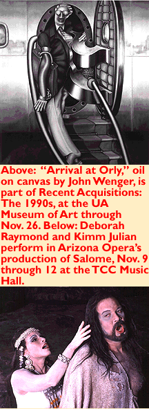 The story swirls around Salome, teen-age step-daughter of powerful King Herod. When she hears the lovely voice of John the Baptist, who has been chained in the cistern by step-dad (don't you love it?), she insists he be brought out so she can see him, says Arizona Opera's Monica Barrows. "She falls in love--well, lust--with him, and wants to kiss him." The spoiled girl, used to getting her way, is ticked handsome John won't buss and schemes to get his lips on hers. Herod, who had promised her anything following one of her erotic dances, is horrified she would ask for J the B's head in payment. When she gets it, minus the body, "she pretty much starts making love to it," in all its bloody beauty, says Barrows. Be forewarned, in case you missed the drift, that this opera has lots of sex, violence and nudity. Ooh, somebody call the NEA.