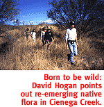 "But to do that, land managers would have to acknowledge they're doing something wrong with the way they administer the land under their care. It entails having to change the status quo, and the Forest Service and BLM are not going to do that voluntarily." In protected Cienega Creek, the tamarisk are clearly being out- competed by the natives. Hogan points out a grove of 15-foot cottonwoods he says are only three years old. Given the right conditions our native species thrive. Groups like the Southwest Center for Biological Diversity are taking an active hand in ensuring Cienega Creek remains one of those places with the right conditions. A few months ago they had a group of people planting native sacaton grass in a dried-out, mud-cracked field populated mainly by Russian thistles, a.k.a. tumbleweeds. Like the tamarisk, tumbleweeds are an unproductive, non-native invader. "They're doing well," Hogan says on inspection. He hopes the sacaton, which can grow five feet high, will spread out and eclipse the tumbleweeds. After that, the carpet of grass will begin to revitalize the soil, and eventually the area might return to the towering mesquite forest it once was. Like the fragile ecosystems in the Amazon destroyed by short-term thinking, when the forest here was cleared, the top soil soon left with it. Agriculture became futile and the area was abandoned as a wasteland. Now, a six-inch clump of grass planted by hand is a symbol of new hope. The story parallels that of ailing riparian areas throughout the desert Southwest. Perhaps if more people get involved, efforts to restore our vital habitats will grow in kind.