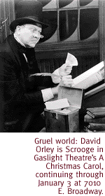 HUMBUG PLUG. Pathetic little Timmy once against rubs shoulders with gnarly old Scrooge--and liberates the old miser's crusty heart--when The Gaslight Theatre rings in the season with Dickens' A Christmas Carol. Starring Dave Orley as Scrooge, the cast also includes a bunch of Gaslight veterans, from John Brownlee and Glenda Young to Betsy Kruse and Joe Cooper.