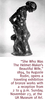 SHOCKING ART. Poetry, politics and passion infuse the fantastic survey of Auguste Rodin's work, now on display in the UA Museum of Art. By 1900, Rodin was considered the world's greatest living artist, and today ranks among the most important sculptors this side of Michelangelo. He repeatedly--and gleefully--shocked the public of his day with sculptures of body parts, nudes in sexual embrace and abstractions of the human form. Throughout, his goal was to communicate the vitality of the human spirit. He succeeded with a flourish, liberating his subject matter and style from stifling 19th-century convention. Culled from the Iris and B. Gerald Cantor collection, this survey contains 62 bronze pieces from The Gates of Hell, The Burghers of Calais and the Monument to Balzac.