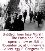 WELL-GROUNDED DISARRAY. Contemporary psychological and emotional figurative explorations dominate Temporal Discord, a new exhibit in the Philabaum Contemporary Art Glass Gallery. Exploring issues from "barbarous acts to casual reveries," the display focuses on issues surrounding the timeless human condition and other light-hearted, contemporary concerns. Featured are works on paper by Daryl Childs, and glass art by Robert Carlson, Bonnie Biggs, Stephen Paul Day, Mark Bokesh-Parsons, Fred diFrenzi, Paul Marioni, Janusz Walentynowicz and Mary Van Cline. Exhibit runs through January 24 in the Philabaum Gallery, 711 S. Sixth Ave. Hours are 10 a.m. to 5 p.m. Monday through Saturday. Call 884-7404 for details.