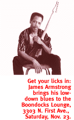 On the block will be everything from furniture and clothing to metal works, ceramic, jewelry and sculpture, with eclectic chow catered by the Landmark Cafe. The market runs from 10 a.m. to 5 p.m. today and tomorrow at the museum's Plaza of the Pioneers, 140 N. Main Ave., with an El Nacimiento reception from 2 to 4 p.m. in the Casa Cordova Courtyard. For details, call 624-2333. STRONG-ARMED. Low-down gut-ripper James Armstrong comes to town in a performance sponsored by the Tucson Blues Society. With a style often compared to Robert Cray, Armstrong "possesses a clear, ringing voice; a concise, stinging lead guitar technique that's all blues," says Living Blues magazine. Learning his licks from a one-time Nat King Cole guitarist, Armstrong formed his first band in seventh grade, and has never stopped getting sullenly soulful. Hear him reach into the rootsy depths tonight at 9 at Boondocks Lounge, 3306 N. First Ave. General admission is $5, and free for TBS members. Call 690-0991 for information.