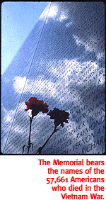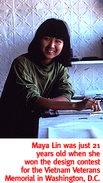 ![]() PBS Explores The Life And Talent Of Architect Maya Lin. By Margaret Regan LONG YEARS AGO, when I was in eighth grade, the nun would let us stand up and look out the classroom window whenever there was a funeral going on at the church across the street. Usually the gray metal coffin being hauled up the outdoor staircase carried some parishioner's grandmother or grandfather. But in the funeral that I remember best from that year you couldn't see the casket's shiny metal surface because it was draped with an American flag. Inside was the body of 18-year-old Michael Callahan, brother of Joseph in our class, dead of war wounds suffered in Vietnam. I thought of Michael again a few summers ago on my first visit to the Vietnam Veterans Memorial in Washington, D.C. The Memorial, as it's been written countless times, is a long black scar in the earth. Arranged in a V-shape on land near the Washington Monument, its granite walls are engraved with the names of the 57,661 Americans who died in the war. The names are listed chronologically by year of death, so when you first enter the monument the wall is rather short, naming the few who died each year in the late '50s and early '60s. As the years go on, though, as the names of dead boys mount up into the thousands and thousands, you must travel deeper into the earth. The wall gets larger and larger, to accommodate the sheer volume of names, and by the time you reach the middle, the section memorializing the war's bloodiest years, you feel overwhelmed by death. After searching in a nearby book register that lists locations, I found Michael's name near the wall's midpoint, where the granite extends highest and deepest. To see in this public place the name of the young boy from my hometown, to touch its carved letters, was extraordinarily emotional. By consecrating the name of one person I knew, it brought back to me full force all the widespread grief occasioned by that stupid war. With each name, the memorial moves fluidly between the individual and the universal. Nowadays, the Vietnam Veterans Memorial is the most visited, and hands-down the most powerful, of all the many public monuments in the nation's capital. Next Wednesday, PBS will air the documentary Maya Lin: A Strong Clear Vision, an Academy Award-winning portrait of the young woman who designed the memorial. Put together over a five-year-period by filmmaker Freida Lee Mock, the movie traces Lin's career, through old footage and new interviews, looking not only at her Vietnam piece, but also at her other public works, including the Civil Rights Monument in Montgomery, Alabama.